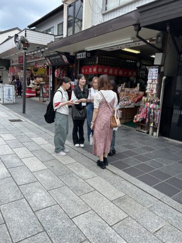 太宰府市、西日本鉄道、西日本シティ銀行の各機関・企業様にご協力いただき、滞在時間の延長、範囲の広域化やオーバーツーリズムなど、さまざまな課題をどのように解消するかを考え、観光資源の発掘と太宰府天満宮参道近隣での観光案内実践に取り組みました。