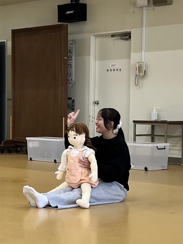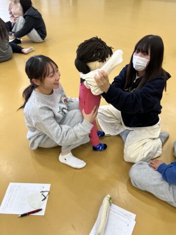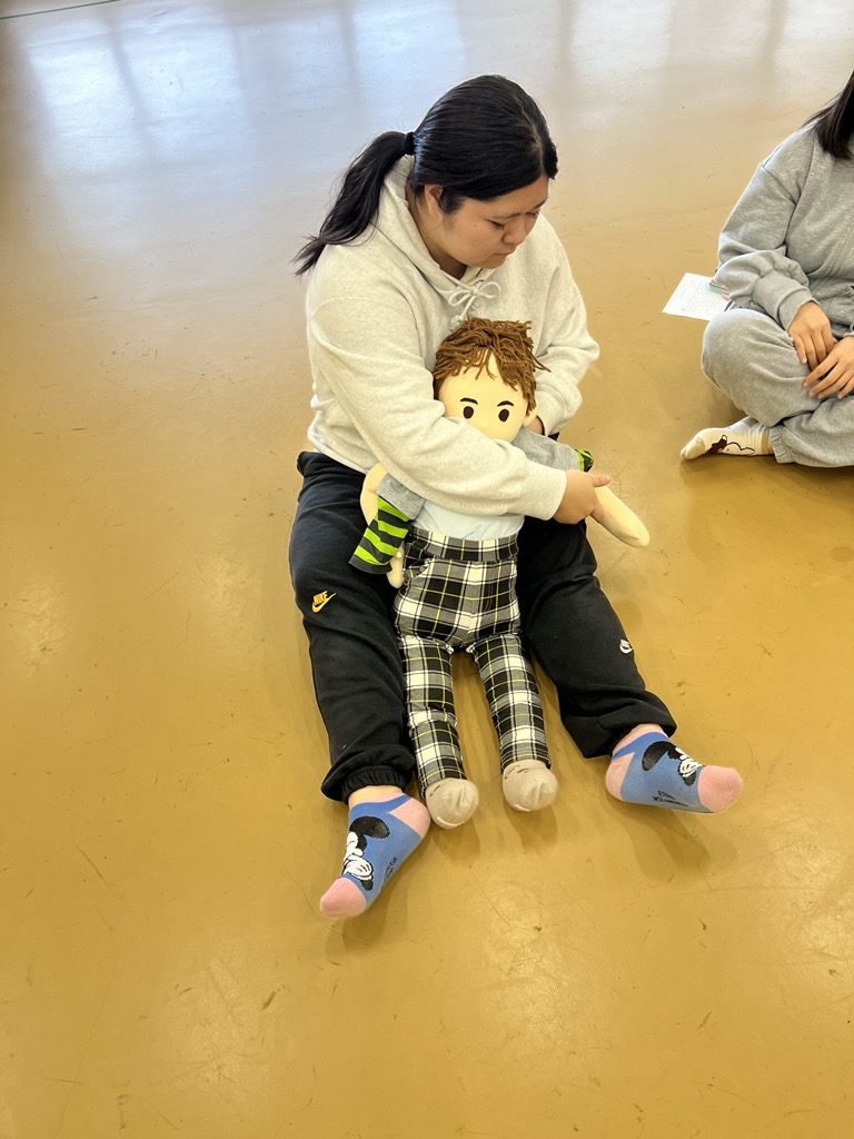 衣服の着脱援助では、子どもの服や靴下の小ささに驚きながらも、肩や肘に負担がかからないように支える位置や動かし方を意識し、安全に脱ぎ着できる方法を丁寧に練習しました。